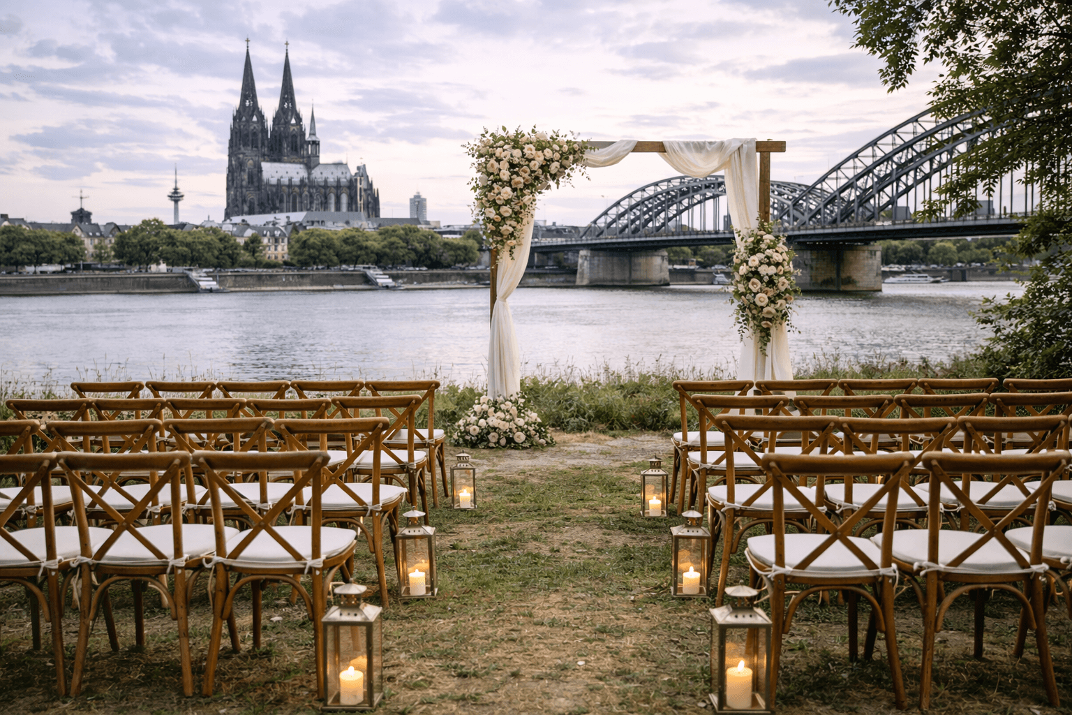 Eine freie Trauung mit Rheinblick fühlt sich offen und groß an – typisch Köln. Besonders gut funktionieren Terrassen oder Uferbereiche, bei denen Empfang und Feier direkt anschließen können. Für Outdoor gilt: Wind und Akustik früh mitdenken.